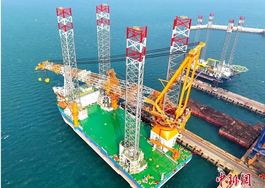 11月16日,航拍“華西1600”1600噸自航自升式風電安裝平臺。當天,該平臺在山東青島交付,這是中國自主設計研發、具有完全自主知識產權的最新一代風電安裝平臺,也是目前中國已交付同類型平臺中樁腿長度最長、主吊機吊高最高、作業水深最大的風電安裝平臺。 張進剛 攝