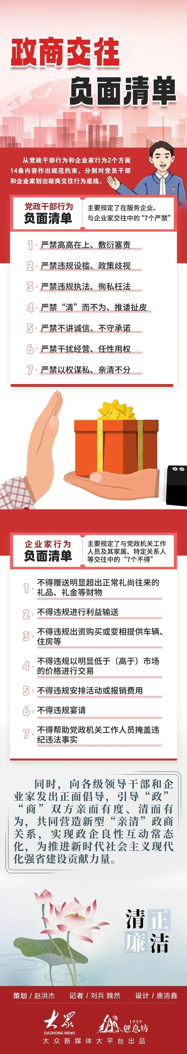 近日,山東省紀委監委印發《政商交往負面清單》,從黨政干部和企業家兩方面作出規范約束,進一步優化營商環境和政治生態,鼓勵領導干部積極主動服務企業發展,保護和激發經營主體活力,推動黨政干部和企業家雙向建立親清統一的新型政商關系。清單都有哪些內容,大眾新聞客戶端記者帶您一圖速覽!