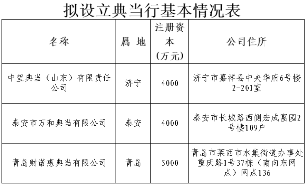根據《典當管理辦法》和《中國銀保監會辦公廳關于加強典當行監督管理的通知》(銀保監辦發〔2020〕38號)等有關規定,經研究,擬同意中璽典當(山東)有限責任公司等3家典當行設立申請事項,現予以公示。公示期為2023年7月3日至2023年7月11日,公示期間如有異議,請向省地方金融監管局反映。