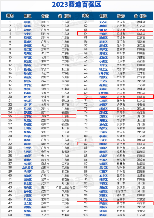具體為濟南市歷下區(25位)、臨沂市蘭山區(54位)、青島市市南區(70位)、濟南市歷城區(74位)、青島市嶗山區(82位)、青島市即墨區(97位)。
