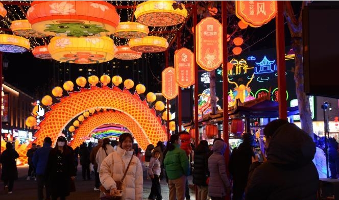 1月7日,山東濟南,第三屆印象濟南“泉城最美花燈會”吸引眾多游人,燈會結合龍年主題,注入故事場景,融合“二安文化”,營造喜慶氛圍,吸引眾多游客賞花燈。圖為游人觀賞花燈。呂妍攝 中新網