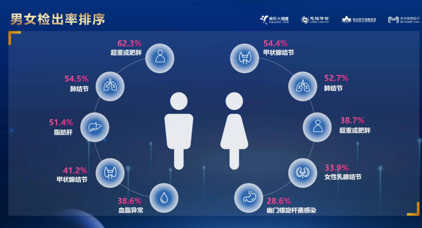 據介紹,《藍皮書》編撰過程廣泛參考國內外權威疾病指南與專家共識,使用臨床公認的疾病診斷與評價方法,對體檢常見疾病或異常檢出率進行標化調整,充分保證了研究結果準確性。 《藍皮書》數據來源于美年健康2023年度近600家體檢中心抽取的樣本,樣本量為1981萬,覆蓋全國31個省、自治區和直轄市,以勞動力人口為主要分析對象。聚焦于心血管健康、內分泌健康、呼吸健康、消化健康與泌尿生殖健康五大領域,主要涵蓋高血壓、糖尿病、肺結節、脂肪肝、腎結石、HPV感染等總計18項疾病或異常指標。 《藍皮書》顯示,體檢異常結果檢出率前五名依次為:肺結節(54%)、超重肥胖(51%)、甲狀腺結節(48%)、脂肪肝(39%)、女性乳腺結節(34%)。也就是說報告中一半體檢人群存在超重、肺結節、甲狀腺結節情況。
