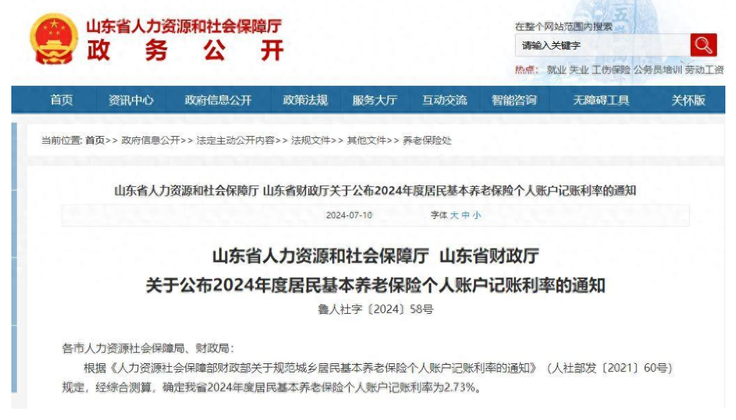 山東省人力資源和社會(huì)保障廳日前下發(fā)通知,山東2024年度居民基本養(yǎng)老保險(xiǎn)個(gè)人賬戶記賬利率為2.73%。