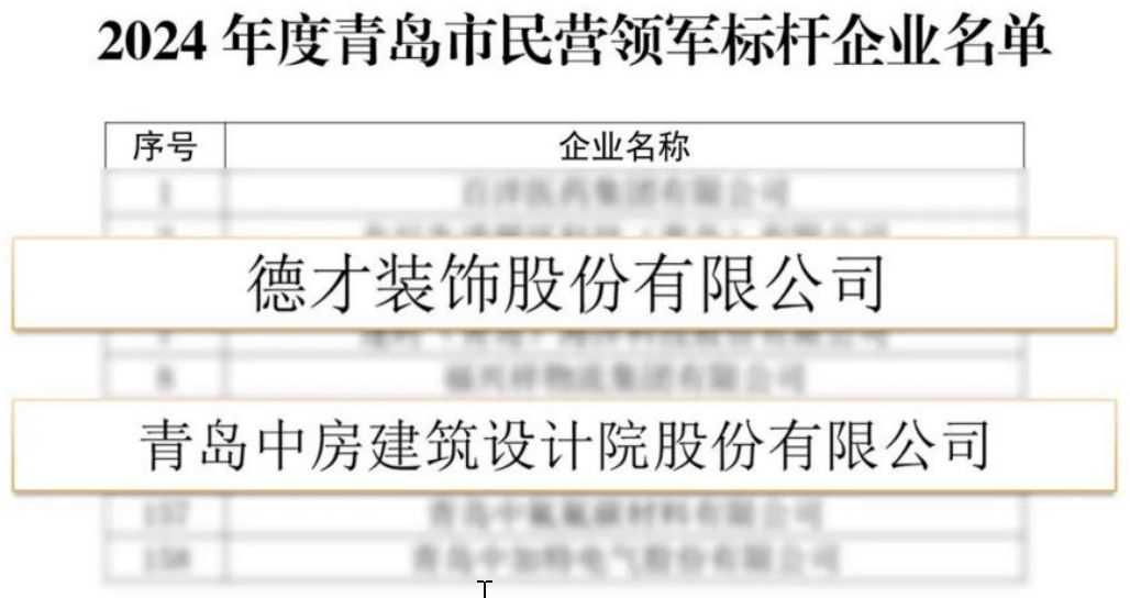 近日,青島市民營經(jīng)濟(jì)發(fā)展局公布2024年度青島市民營領(lǐng)軍標(biāo)桿企業(yè)名單,德才股份連續(xù)第三年榮獲“青島市民營領(lǐng)軍標(biāo)桿企業(yè)”稱號,旗下中房設(shè)計首次入圍該榜單。