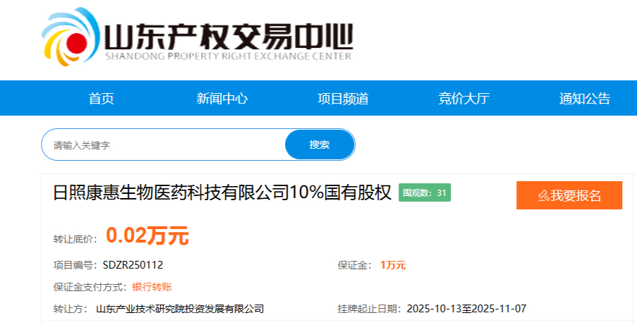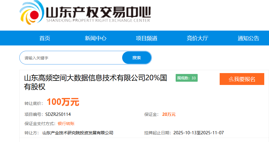 山東產(chǎn)業(yè)技術(shù)研究院投資發(fā)展有限公司近日在山東產(chǎn)權(quán)交易中心披露了兩條掛牌轉(zhuǎn)讓信息,意味著其要退出日照康惠生物醫(yī)藥科技有限公司、山東高頻空間大數(shù)據(jù)信息技術(shù)有限公司,轉(zhuǎn)讓底價(jià)分別為0.02萬元、100萬元。