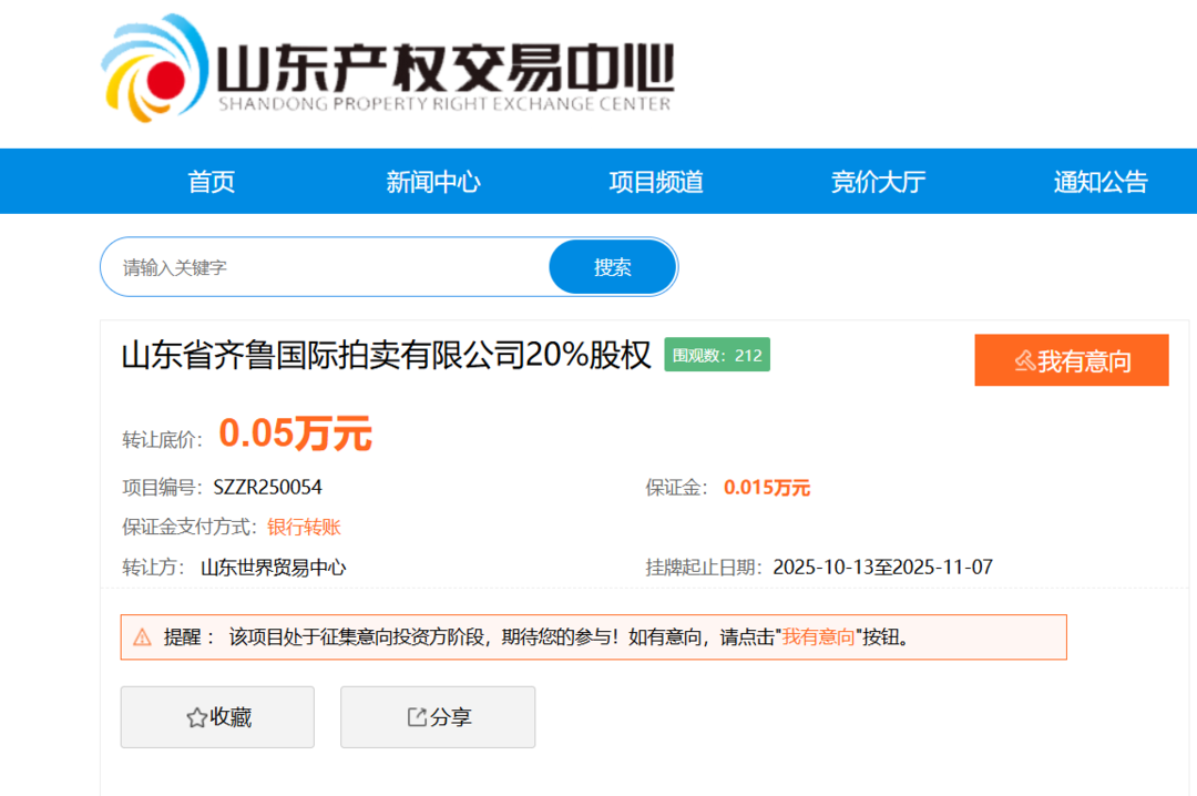 10月13日,山東省齊魯國(guó)際拍賣(mài)有限公司(下稱(chēng)“齊魯國(guó)際拍賣(mài)”)20%股權(quán)在山東產(chǎn)權(quán)交易中心掛牌轉(zhuǎn)讓?zhuān)D(zhuǎn)讓底價(jià)500元,轉(zhuǎn)讓方為山東世界貿(mào)易中心(下稱(chēng)“山東世貿(mào)中心”)。