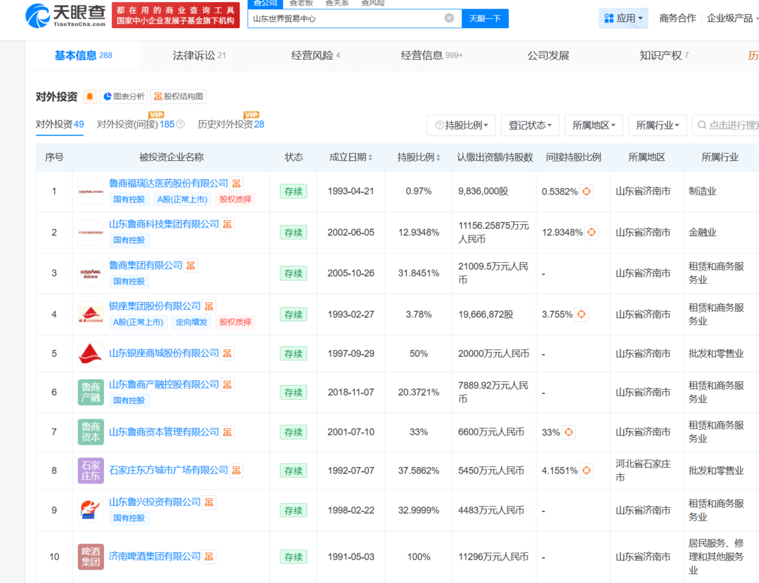 天眼查信息顯示,山東世貿(mào)中心直接對(duì)外投資了30多家公司,包括山東魯商科技集團(tuán)有限公司、福瑞達(dá)(600223.SH)、銀座股份(600828.SH)、濟(jì)南啤酒集團(tuán)有限公司、重慶魯商地產(chǎn)有限公司、石家莊東方城市廣場(chǎng)有限公司等。此外,還間接投資了180多家公司。