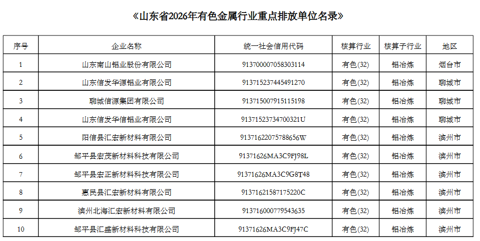 鋁冶煉企業10家,包括山東南山鋁業有限公司、山東信發華源鋁業有限公司等。