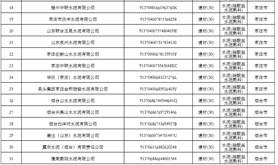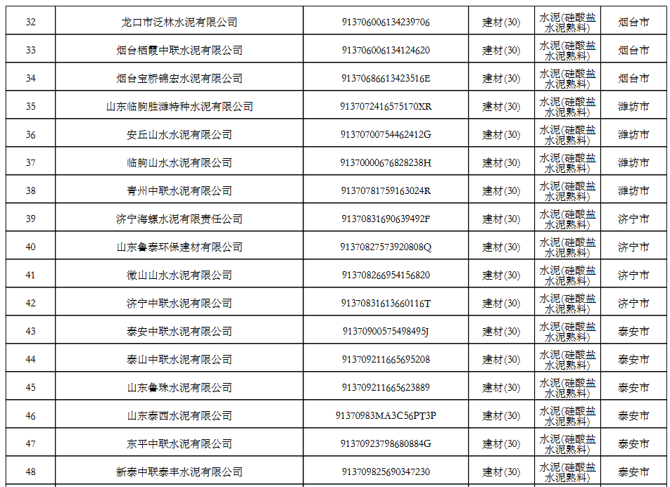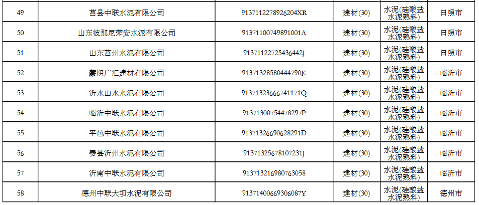 水泥企業59家,包括平陰山水水泥有限公司、山東東華科技有限公司等;