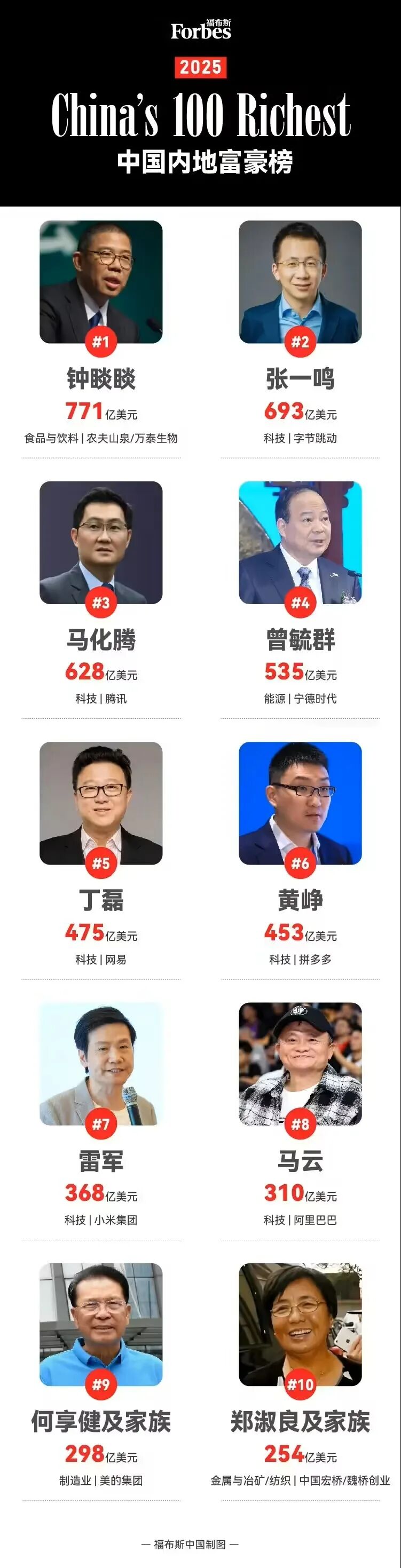 11月7日,2025福布斯中國內地富豪榜發布,農夫山泉創始人鐘睒睒連續第五年蟬聯榜首,字節跳動聯合創始人張一鳴、騰訊董事會主席馬化騰位列前三。