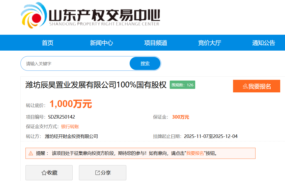 11月7日,濰坊辰昊置業(yè)發(fā)展有限公司(下稱“辰昊置業(yè)”)100%國有股權(quán)在山東產(chǎn)權(quán)交易中心掛牌轉(zhuǎn)讓,轉(zhuǎn)讓底價1000萬元,轉(zhuǎn)讓方為濰坊經(jīng)開財金投資有限公司(下稱“濰坊經(jīng)開財金”)。