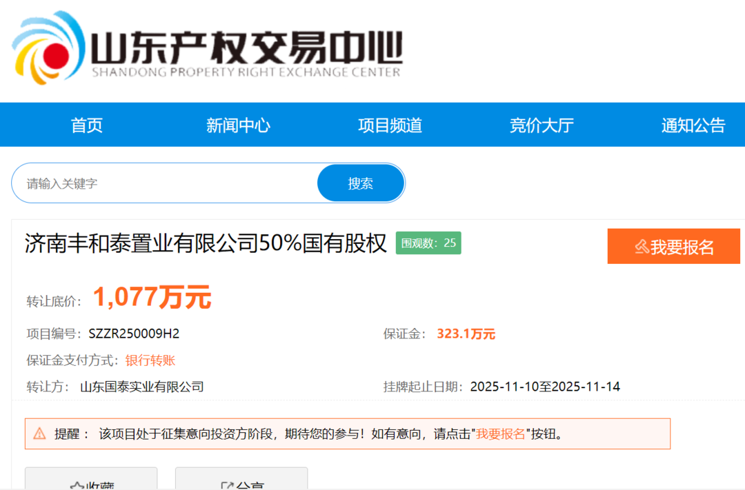 11月10日,濟南豐和泰置業有限公司(下稱“豐和泰置業”)50%國有股權在山東產權交易中心掛牌轉讓,轉讓底價1077萬元,轉讓方為山東發展投資控股集團有限公司旗下的山東國泰實業有限公司(下稱“國泰實業”)。這是該公司年內第四次嘗試轉讓豐和泰置業股權,每次掛牌底價逐步降低,今年9月8日、6月20日、2月25日的掛牌轉讓底價分別為1230.2萬元、2240.58萬元、4765.75萬元。