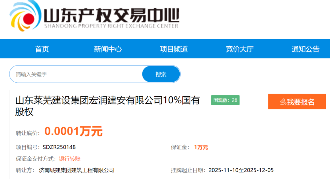 11月10日,濟南城建集團建筑工程有限公司以1元底價在山東產權交易中心掛牌轉讓山東萊蕪建設集團宏潤建安有限公司(下稱“宏潤建安”)10%國有股權。