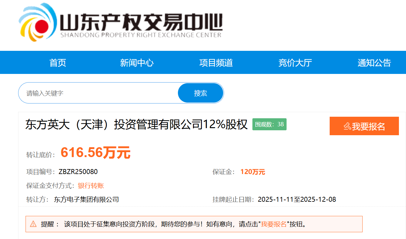 11月11日,東方英大(天津)投資管理有限公司(下稱“東方英大”)12%股權在山東產權交易中心掛牌轉讓,轉讓底價為616.56萬元,轉讓方為東方電子集團有限公司(下稱“東方電子集團”)。