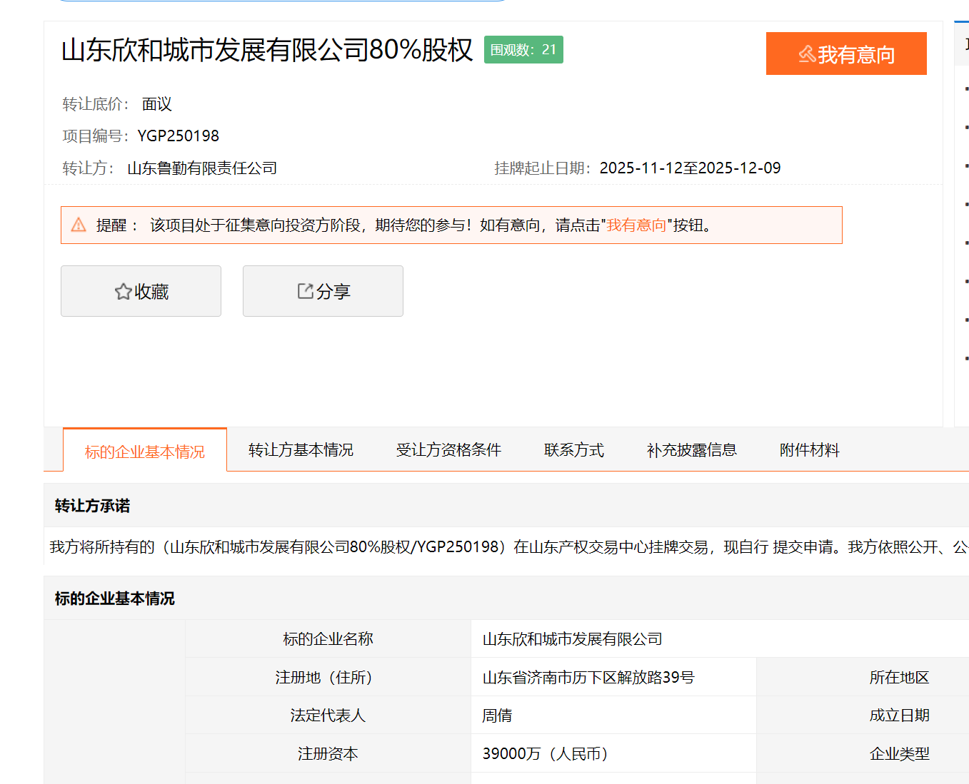 11月12日,山東欣和城市發展有限公司80%股權在山東產權交易中心掛牌轉讓預披露,轉讓方為省屬國企山東省財欣資產運營有限公司全資控股的子公司山東魯勤有限責任公司。