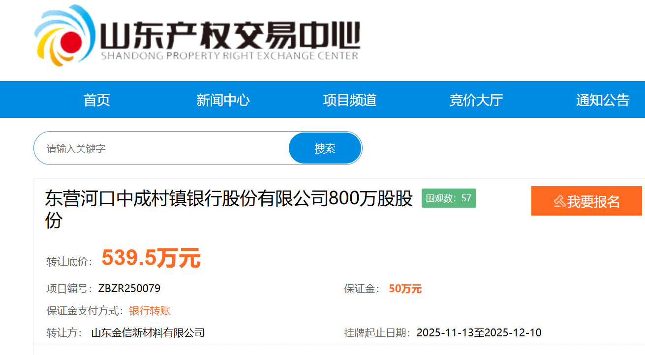 11月13日,東營河口中成村鎮銀行股份有限公司(下稱“河口中成村鎮銀行”)800萬股股份在山東產權交易中心掛牌轉讓,轉讓底價539.5萬元,轉讓方為山東金信新材料有限公司(下稱“山東金信”)。