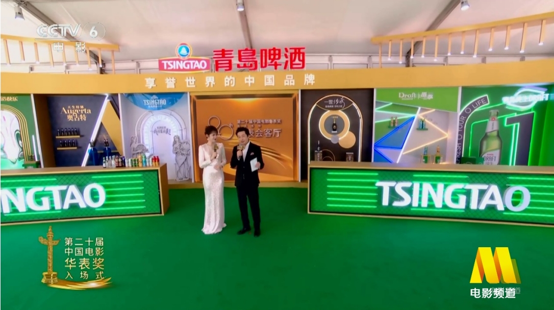 百米紅毯兩側,青島啤酒logo燈箱與青島啤酒手舉牌交相輝映,甚至有嘉賓舉著青島啤酒就走上紅毯,讓星光熠熠的華表獎紅毯,多了煙火氣的“松弛感”。而主持人更是現場“安利”紅毯嘉賓,來青島團建“喝青島啤酒”。