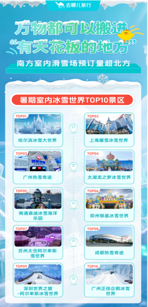 去哪兒旅行數據顯示,7月以來,全國室內滑雪與冰雪樂園預訂量同比翻番,南方室內滑雪場預訂量超北方,廣州熱雪奇跡門票訂單量同比增長4倍,蘇州太倉阿爾卑斯雪世界帶動周邊酒店預訂量同比增長四成。此外,室內沖浪、室內海釣、室內趕海、室內攀巖等新業態遍地開花,搜索熱度環比增逾10倍。