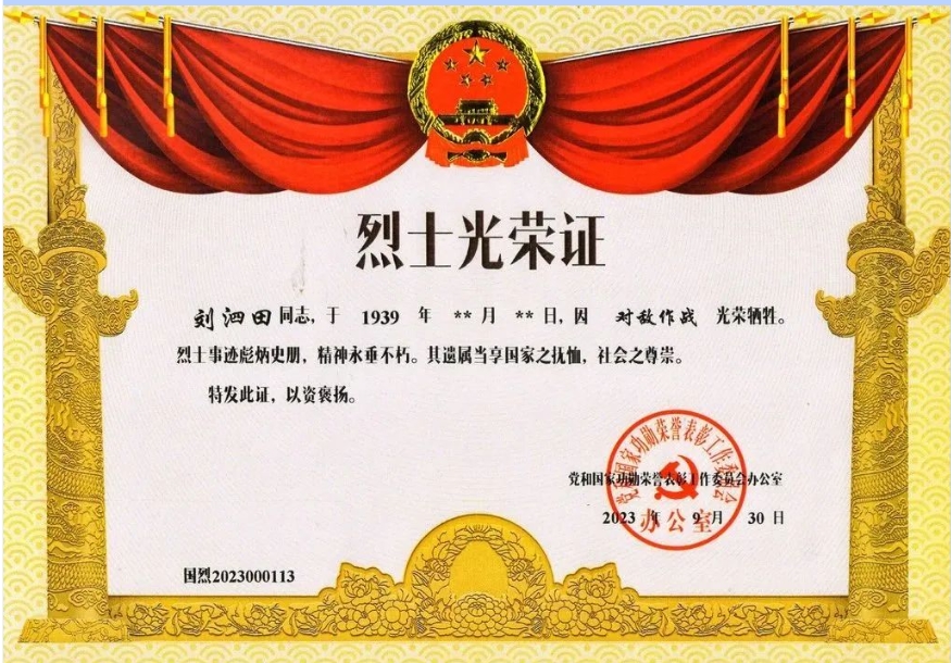 2022年10月,山東省人民政府追認劉泗田為烈士。2023年9月,黨和國家功勛榮譽表彰工作委員會辦公室為其頒發“烈士光榮證”。2024年4月,劉泗田烈士遺骸遷葬滕州市烈士陵園。