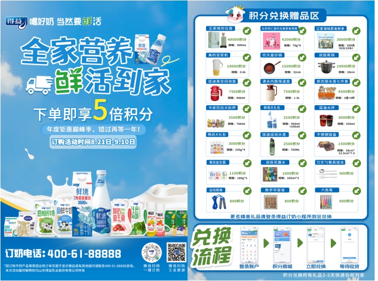 八月清風(fēng)送爽,得益乳業(yè)一年一度的“雙月訂奶”活動(dòng)如期而至。今年活動(dòng)全面升級(jí),8月21日至9月10日期間,訂滿60天即享5倍積分、積分可兌超30余款好禮等多重暖心優(yōu)惠。作為中國(guó)低溫奶專(zhuān)家的得益乳業(yè),更創(chuàng)新融合直播方式,邀請(qǐng)百位達(dá)人深入解讀得益乳業(yè)“送奶到家”服務(wù)的健康價(jià)值與便捷體驗(yàn),共同為山東千萬(wàn)家庭帶來(lái)一場(chǎng)鮮活的營(yíng)養(yǎng)盛宴。